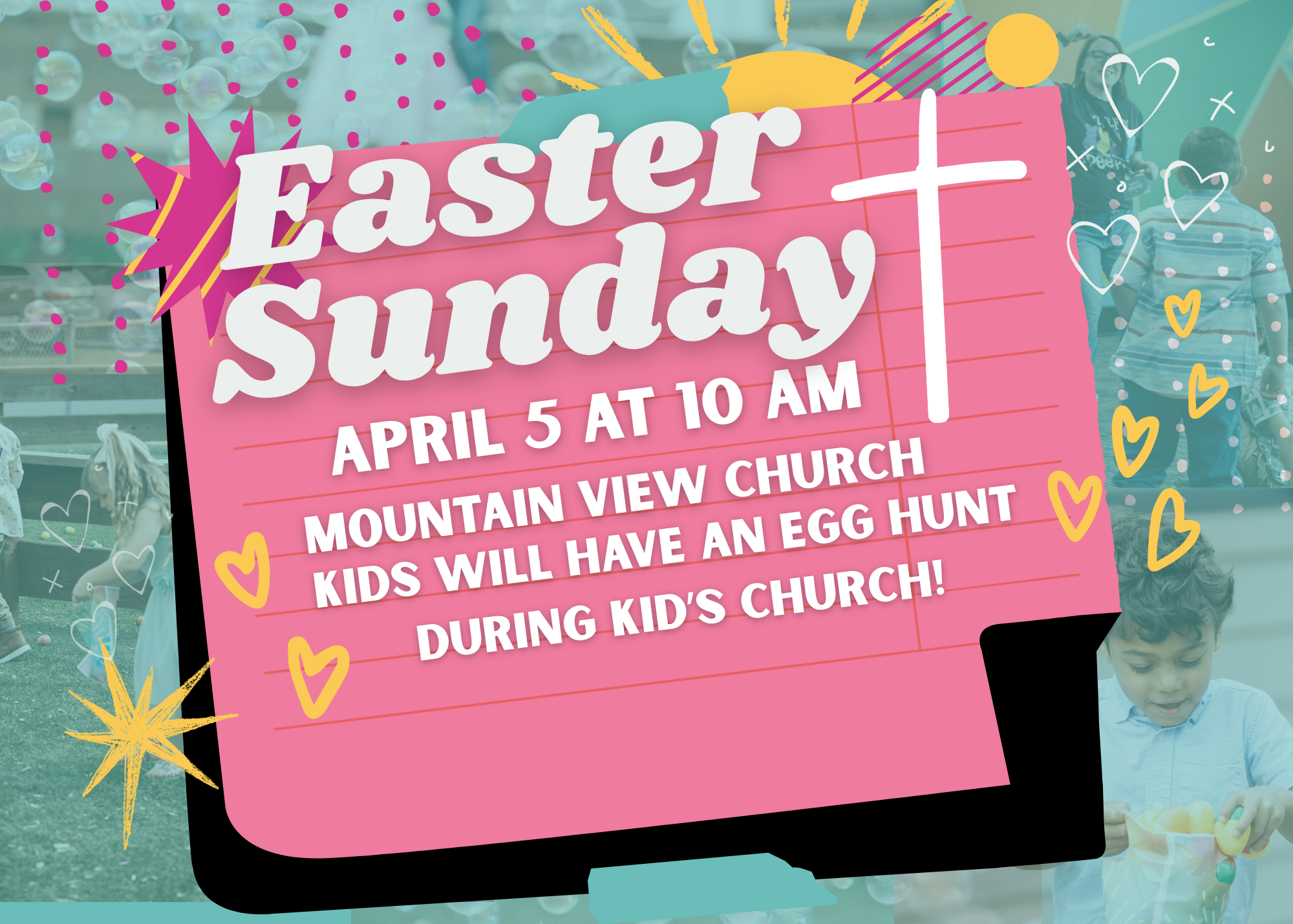 Join us in celebration of our risen Savior! We will be having an Easter Egg Hunt during Kid's Church, worship service just for kids and a special Easter gift for kids to take home. We look forward to seeing you.