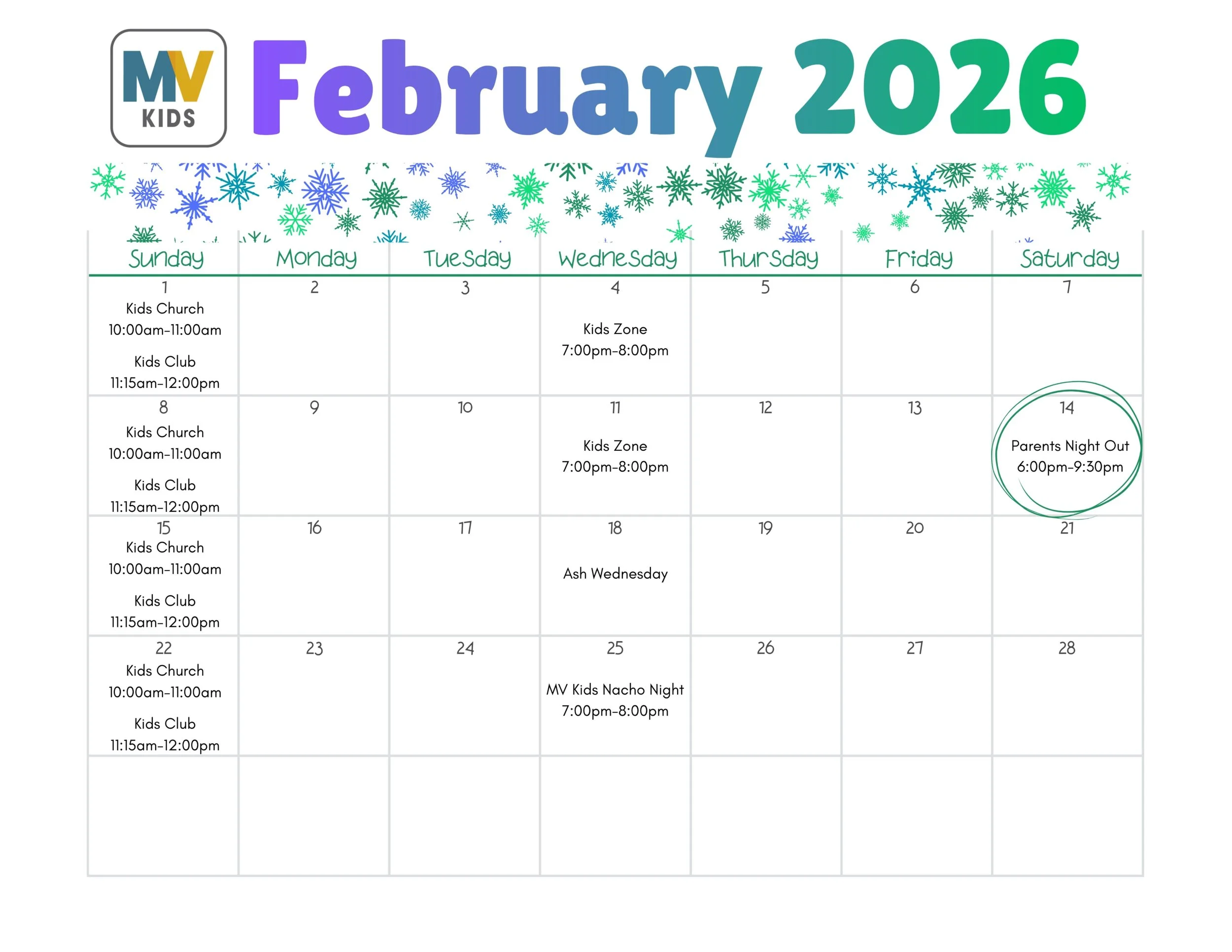 Kids in nursery - 5th grades are invited to stay for Kids Club each Sunday from 11:15am-12:00pm. Sign up for Kids Club as you check your child in for Kids Church and the MV Kids leaders will help transition them from Kids Church to Kids Club each week. Kids will explore a monthly theme through snacks, games and more.